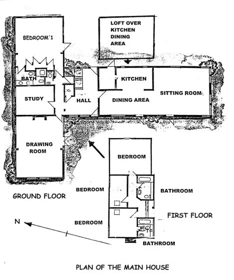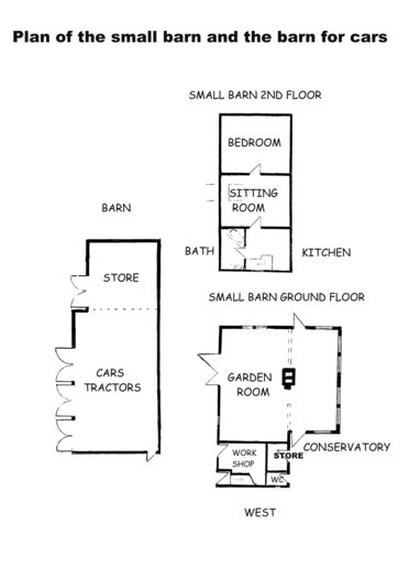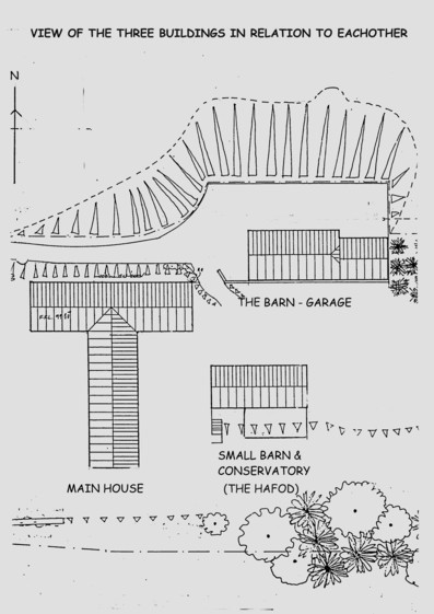 A plan of the small barn (the Hafod), conservatory and The Barn (for cars, etc.)